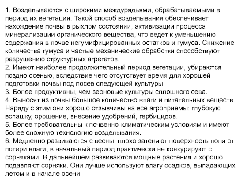 Слайд 271. Возделываются с широкими междурядьями, обрабатываемыми в период их вегетации.
