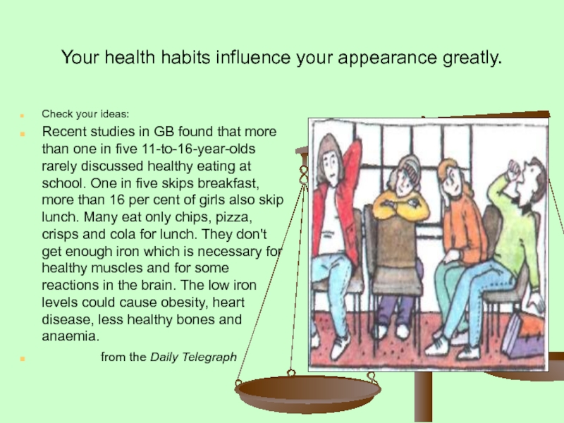 Слайд 10Your health habits influence your appearance greatly.