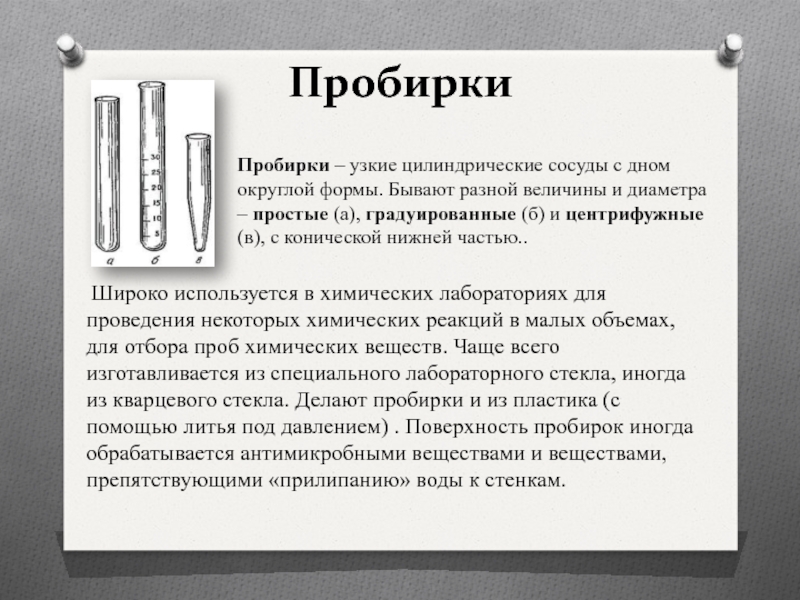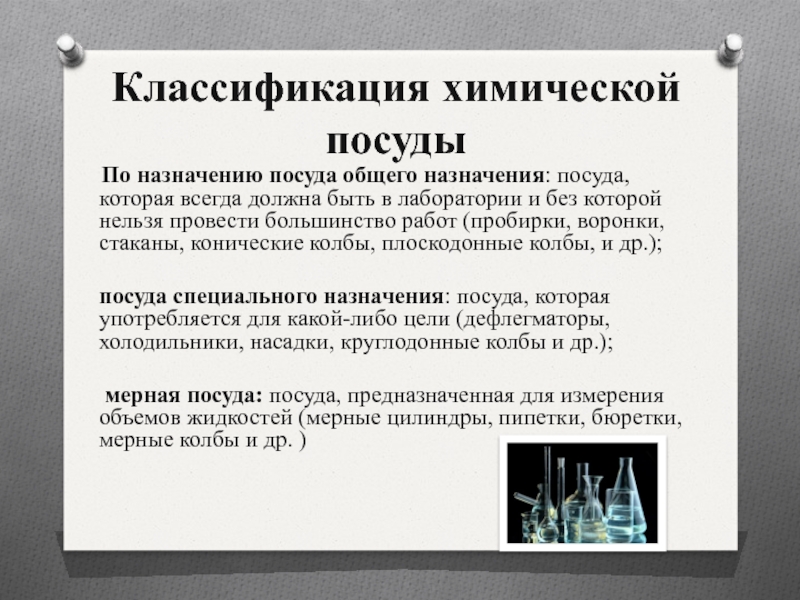 провести большинство работ (пробирки, воронки, стаканы, конические колбы, плоскодонные колбы, и др.);посуда специального назначения: посуда, которая употребляется для какой-либо цели (дефлегматоры, холодильники, насадки, круглодонные колбы и др.);