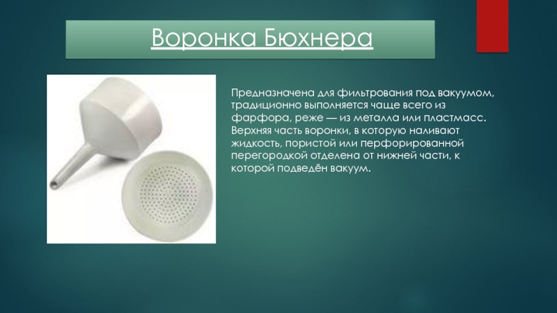 из металла или пластмасс. Верхняя часть воронки, в которую наливают жидкость, пористой или перфорированной перегородкой отделена от нижней части, к которой подведён вакуум.