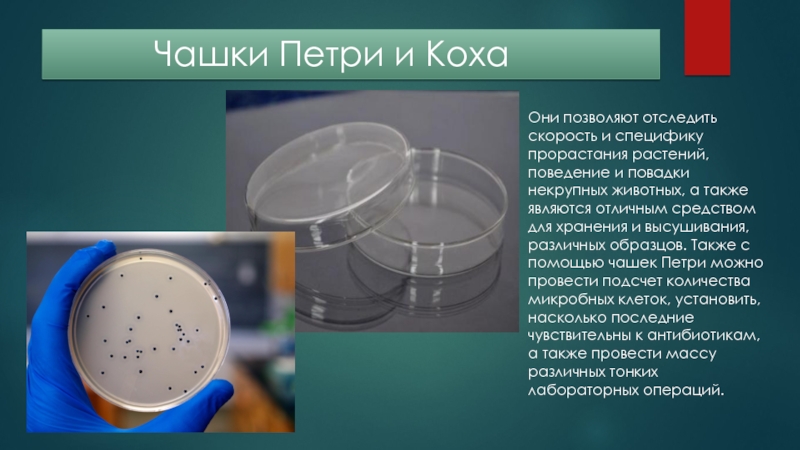 некрупных животных, а также являются отличным средством для хранения и высушивания, различных образцов. Также с помощью чашек Петри можно провести подсчет количества микробных клеток, установить, насколько последние чувствительны к антибиотикам, а также провести массу различных тонких лабораторных операций.