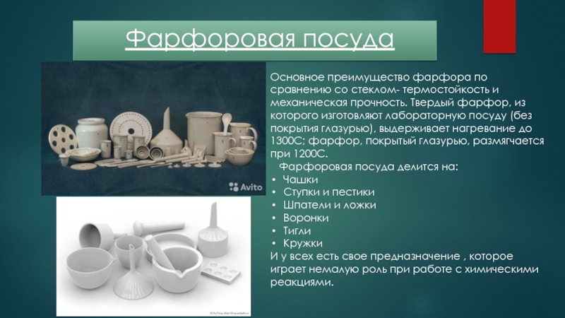 из которого изготовляют лабораторную посуду (без покрытия глазурью), выдерживает нагревание до 1300С; фарфор, покрытый глазурью, размягчается при 1200С.