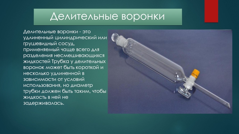 жидкостей Трубка у делительных воронок может быть короткой и несколько удлиненной в зависимости от условий использования, но диаметр трубки должен быть таким, чтобы жидкость в ней не задерживалась.