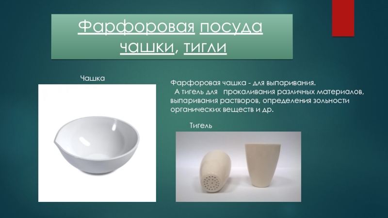 А тигель для прокаливания различных материалов, выпаривания растворов, определения зольности органических веществ и др.