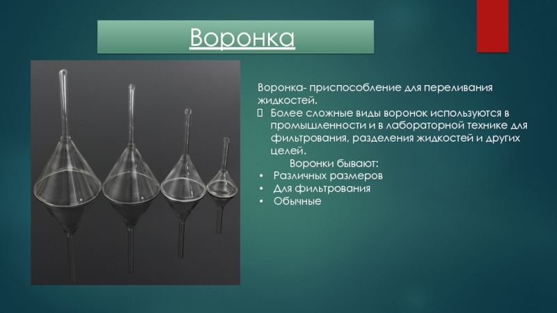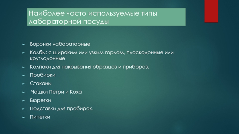 Слайд 4Наиболее часто используемые типы лабораторной посуды