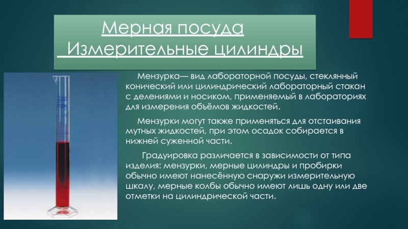 Мерная посуда – сосуды с градуированной шкалой, предназначенные для измерения объема жидких веществ. К этой категории относятся мерные цилиндры, колбы, пипетки, пробирки.
