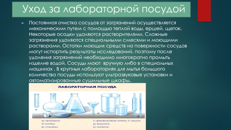 осадки удаляются растворителями. Сложные загрязнения удаляются специальными смесями и моющими растворами. Остатки моющих средств на поверхности сосудов могут испортить результаты исследований, поэтому после удаления загрязнений необходимо многократно промыть изделие водой. Сосуды моют вручную либо в специальных машинах . В крупных лабораториях для мытья большого количества посуды используют ультразвуковые установки и автоматизированные сушильные шкафы.