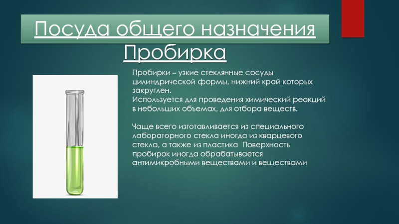 лабораторной посуды, тонкостенная цилиндрическая ёмкость с плоским дном.