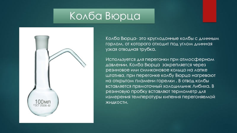 Используется для перегонки при атмосферном давлении. Колба Вюрца закрепляется через резиновое или силиконовое кольцо на лапке штатива, при перегонке колбу Вюрца нагревают на открытом пламени горелки . В отвод колбы вставляется прямоточный холодильник Либиха. В резиновую пробку вставляют термометр для измерения температуры кипения перегоняемой жидкости.