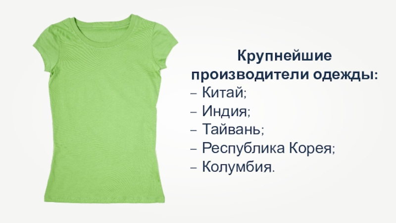 Крупнейшие производители одежды:– Китай;– Индия;– Тайвань;– Республика Корея;– Колумбия.