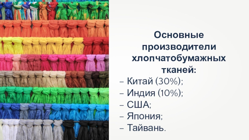 Основные производители хлопчатобумажных тканей:– Китай (30%);– Индия (10%);– США;– Япония;– Тайвань.