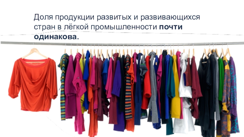 Доля продукции развитых и развивающихся стран в лёгкой промышленности почти одинакова.