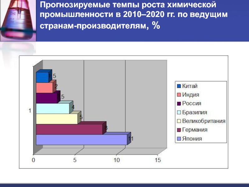 Слайд 49Прогнозируемые темпы роста химической промышленности в 2010–2020 гг. по ведущим