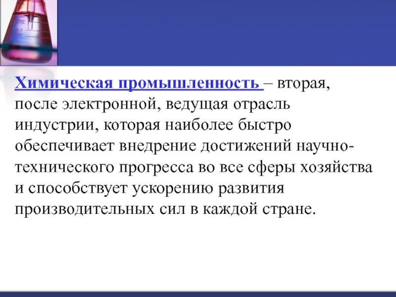 Слайд 4Химическая промышленность – вторая, после электронной, ведущая отрасль индустрии, которая