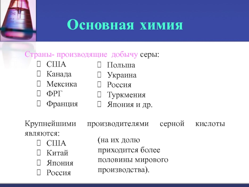 по производству серной кислоты: США, Япония, Канада, Франция, Германия, Испания,