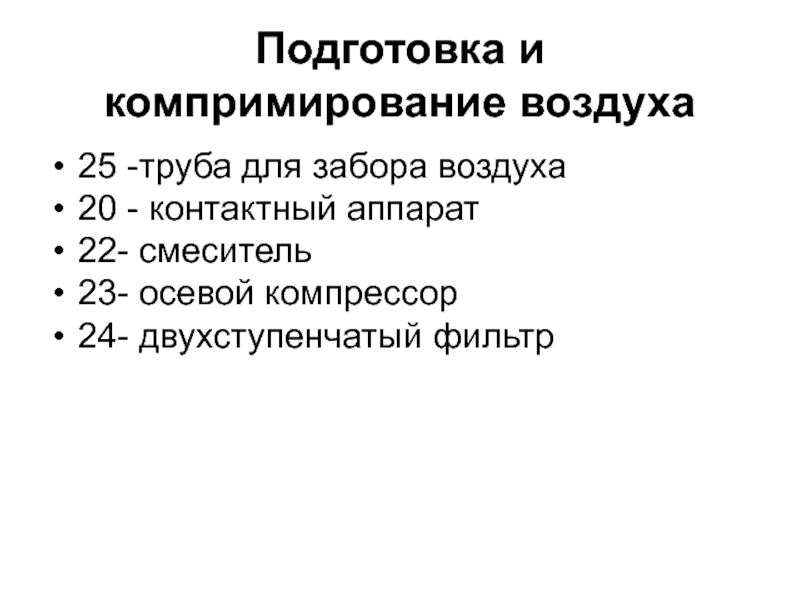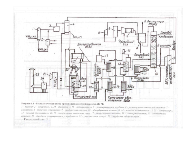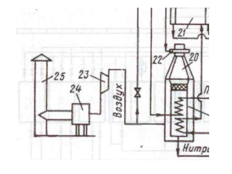 2 – 3,7 ат, нагреваясь до 130 – 210 оС. Сжатый воздух разделяется на 2 потока. Основной поток идёт в контактный аппарат 20 (в кольцевые зазоры корпуса). Второй поток (10 – 14 %) идёт в подогреватель аммиака 4, затем в продувочную колонну 9 для отдувки растворённых в кислоте оксидов азота.