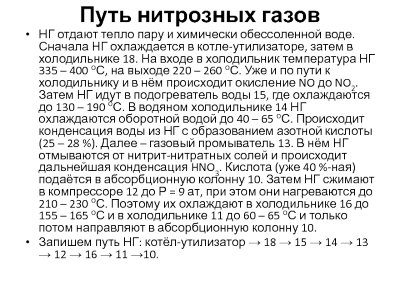 входе в холодильник температура НГ 335 – 400 оС, на выходе 220 – 260 оС. Уже и по пути к холодильнику и в нём происходит окисление NO до NO2. Затем НГ идут в подогреватель воды 15, где охлаждаются до 130 – 190 оС. В водяном холодильнике 14 НГ охлаждаются оборотной водой до 40 – 65 оС. Происходит конденсация воды из НГ с образованием азотной кислоты (25 – 28 %). Далее – газовый промыватель 13. В нём НГ отмываются от нитрит-нитратных солей и происходит дальнейшая конденсация HNO3. Кислота (уже 40 %-ная) подаётся в абсорбционную колонну 10. Затем НГ сжимают в компрессоре 12 до Р = 9 ат, при этом они нагреваются до 210 – 230 оС. Поэтому их охлаждают в холодильнике 16 до 155 – 165 оС и в холодильнике 11 до 60 – 65 оС и только потом направляют в абсорбционную колонну 10.