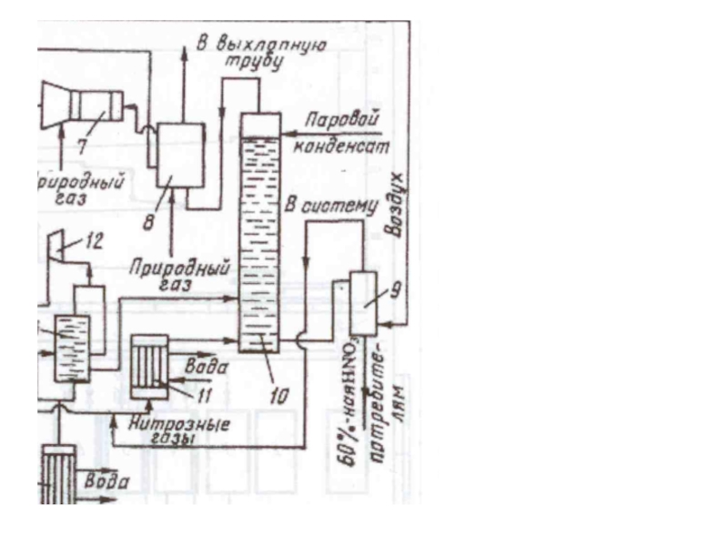 Процесс абсорбции идёт при давлении не выше 9 ат с постоянным отводом тепла реакций оборотной водой с температурой не выше 27 оС. Снизу выходит 58 – 60 %-ная азотная кислота. Она идёт в продувочную колонну 9 для удаления растворённых оксидов азота.