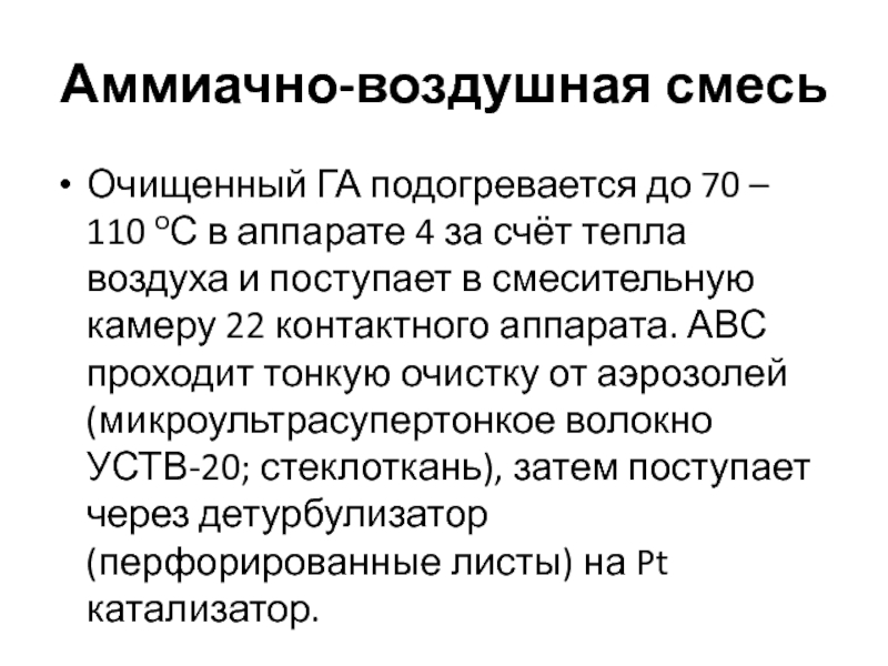 камеру 22 контактного аппарата. АВС проходит тонкую очистку от аэрозолей (микроультрасупертонкое волокно УСТВ-20; стеклоткань), затем поступает через детурбулизатор (перфорированные листы) на Pt катализатор.