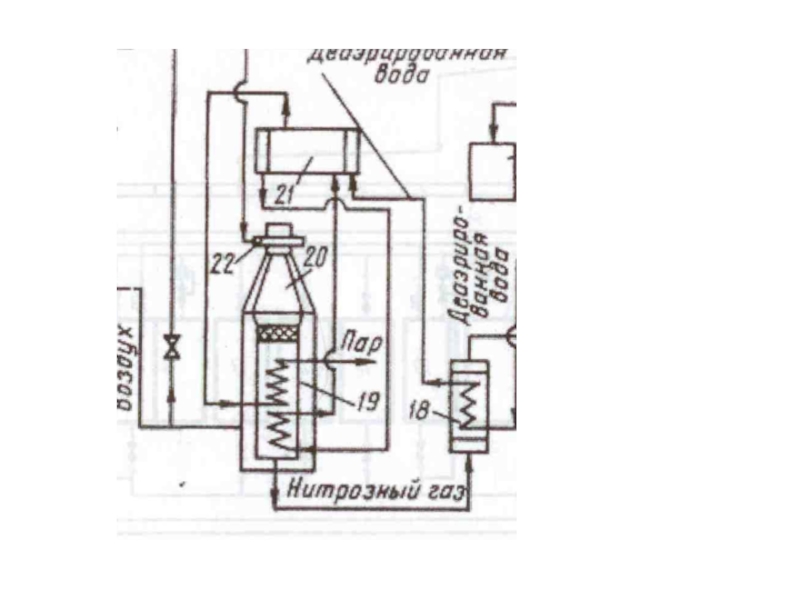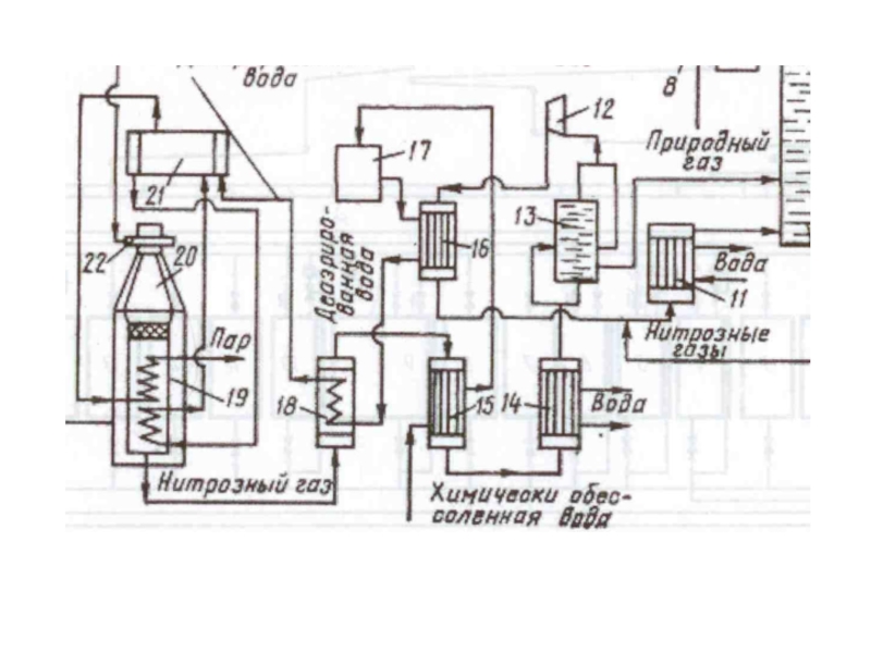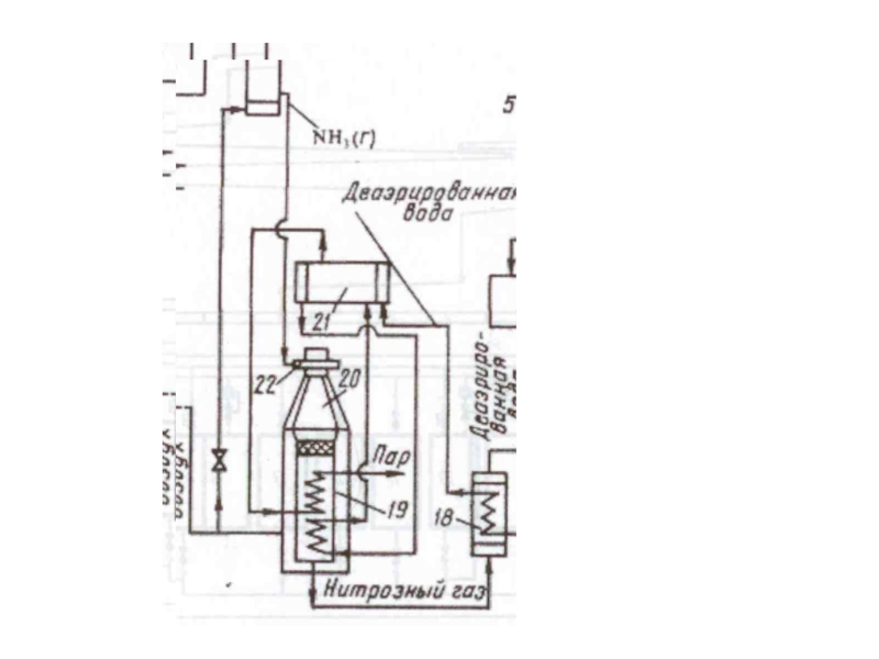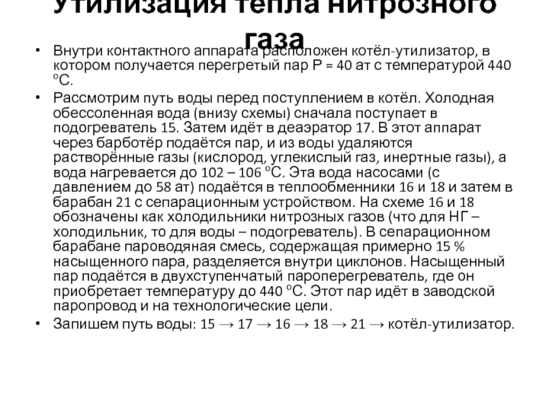 Рассмотрим путь воды перед поступлением в котёл. Холодная обессоленная вода (внизу схемы) сначала поступает в подогреватель 15. Затем идёт в деаэратор 17. В этот аппарат через барботёр подаётся пар, и из воды удаляются растворённые газы (кислород, углекислый газ, инертные газы), а вода нагревается до 102 – 106 оС. Эта вода насосами (с давлением до 58 ат) подаётся в теплообменники 16 и 18 и затем в барабан 21 с сепарационным устройством. На схеме 16 и 18 обозначены как холодильники нитрозных газов (что для НГ – холодильник, то для воды – подогреватель). В сепарационном барабане пароводяная смесь, содержащая примерно 15 % насыщенного пара, разделяется внутри циклонов. Насыщенный пар подаётся в двухступенчатый пароперегреватель, где он приобретает температуру до 440 оС. Этот пар идёт в заводской паропровод и на технологические цели.