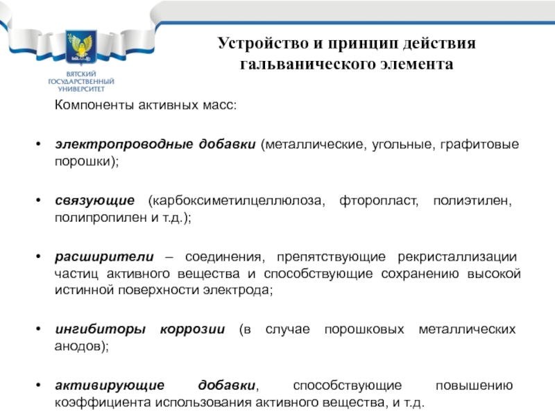 активирующие добавки, способствующие повышению коэффициента использования активного вещества, и т.д.