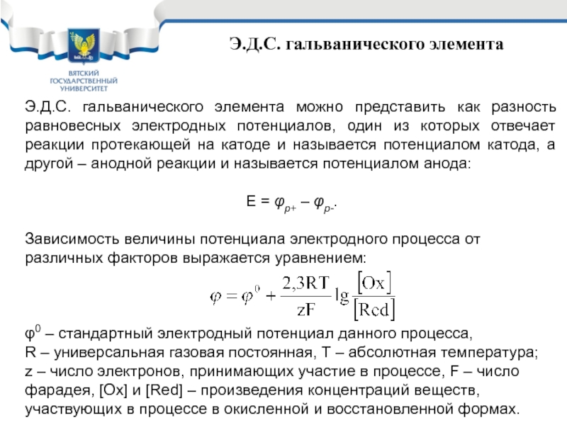 Э.Д.С. гальванического элемента можно представить как разность равновесных