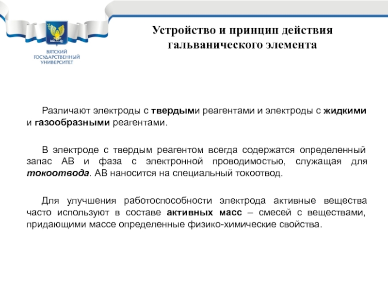 Для улучшения работоспособности электрода активные вещества часто используют в составе активных масс – смесей с веществами, придающими массе определенные физико-химические свойства.