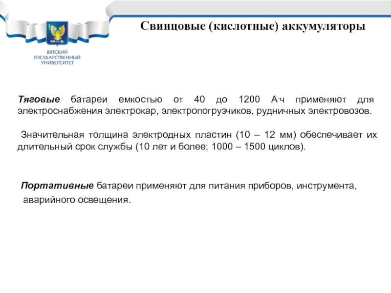 применяют для электроснабжения электрокар, электропогрузчиков, рудничных электровозов.