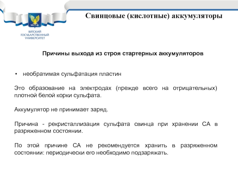 Причина - рекристаллизация сульфата свинца при хранении СА в разряженном состоянии.