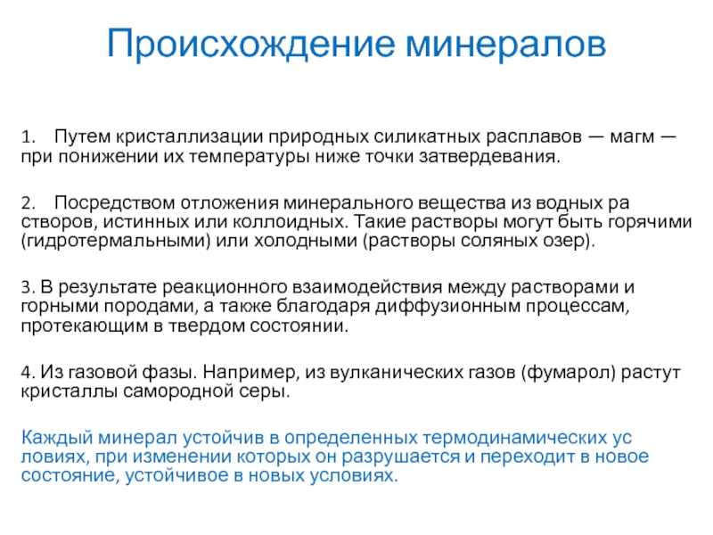 Каждый минерал устойчив в определенных термодинамических условиях, при изменении которых он разрушается и переходит в новое состояние, устойчивое в новых условиях.