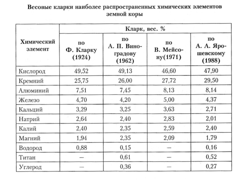 Кларк определил распространенность в земной коре 50 наиболее распространенных элементов (1989 г.)