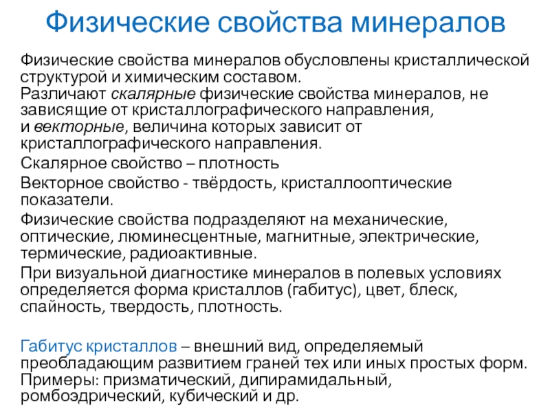 Физические свойства минералов обусловлены кристаллической структурой и химическим