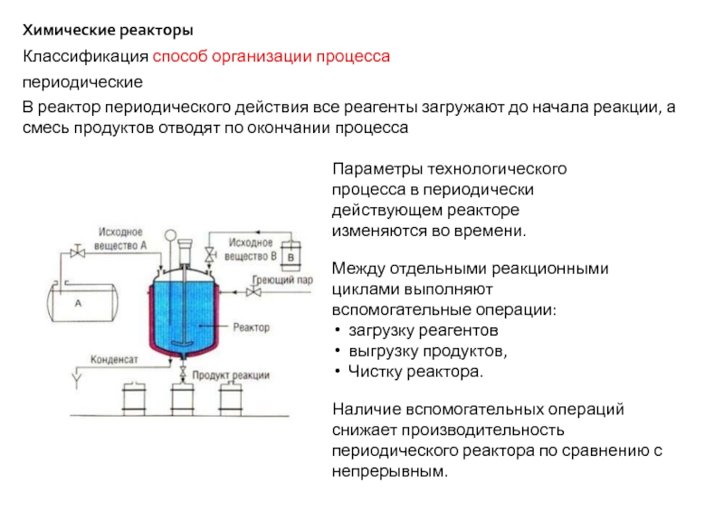 Наличие вспомогательных операций снижает производительность периодического реактора по сравнению с непрерывным.