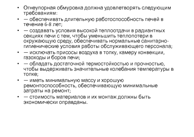 Слайд 49Огнеупорная обмуровка должна удовлетворять следующим требованиям: