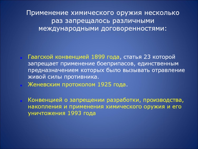 Применение химического оружия несколько раз запрещалось различными международными договоренностями:
