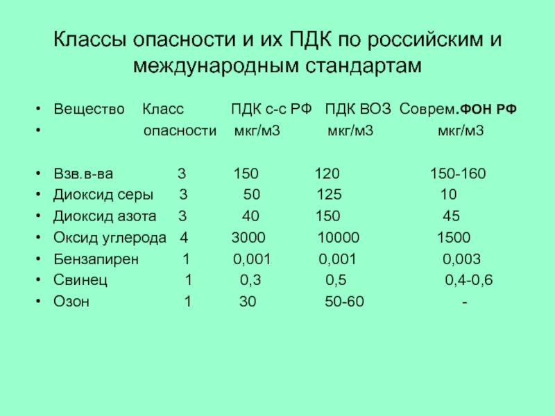 Слайд 7Классы опасности и их ПДК по российским и международным стандартам