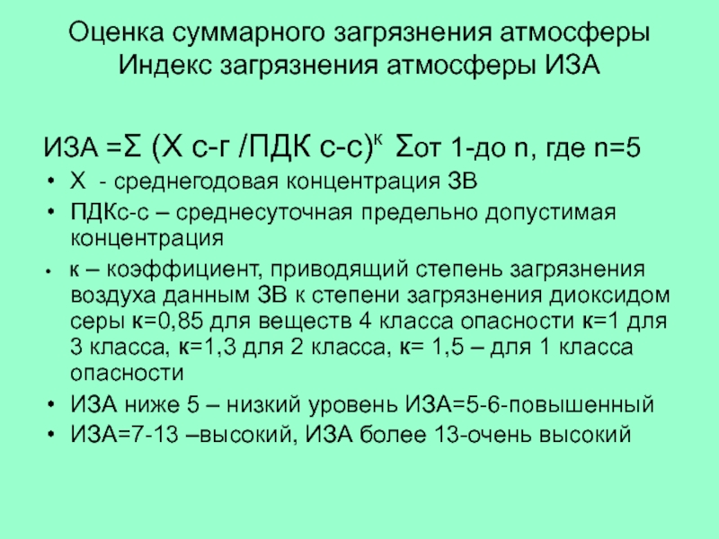 Слайд 5Оценка суммарного загрязнения атмосферы Индекс загрязнения атмосферы ИЗА