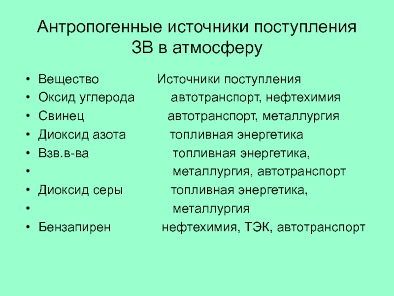 Слайд 9Антропогенные источники поступления ЗВ в атмосферу