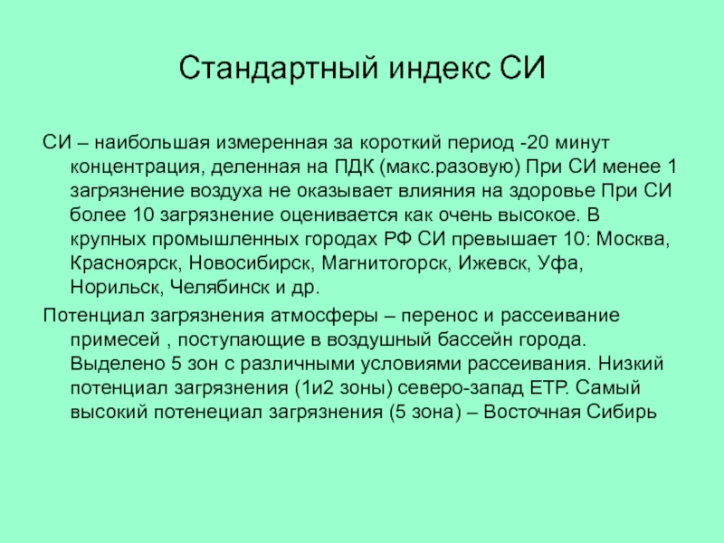 загрязнение воздуха не оказывает влияния на здоровье При СИ более 10 загрязнение оценивается как очень высокое. В крупных промышленных городах РФ СИ превышает 10: Москва, Красноярск, Новосибирск, Магнитогорск, Ижевск, Уфа, Норильск, Челябинск и др.