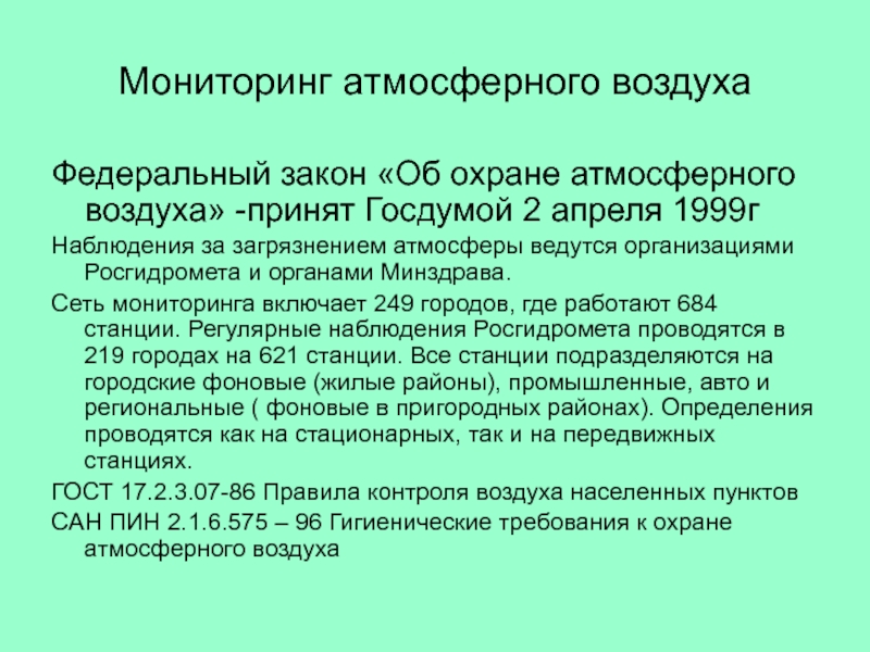 САН ПИН 2.1.6.575 – 96 Гигиенические требования к охране атмосферного воздуха