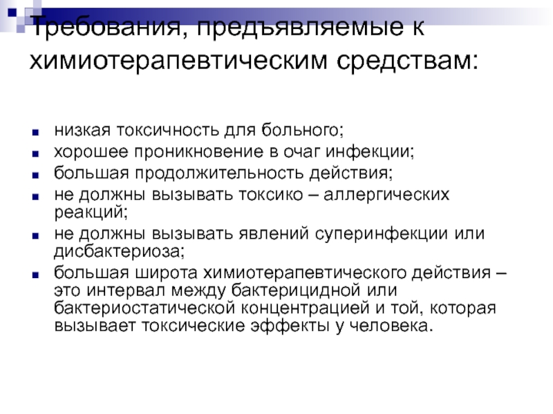 Слайд 3Требования, предъявляемые к химиотерапевтическим средствам: