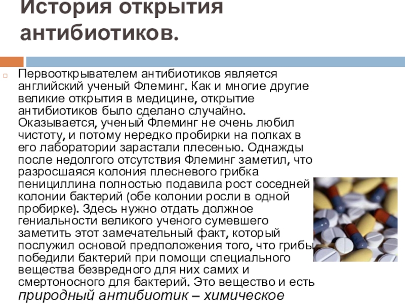 Первооткрывателем антибиотиков является английский ученый Флеминг. Как и
