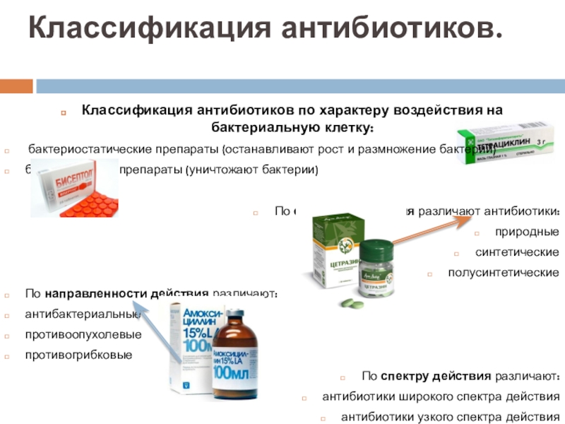 Слайд 7Классификация антибиотиков по характеру воздействия на бактериальную клетку: