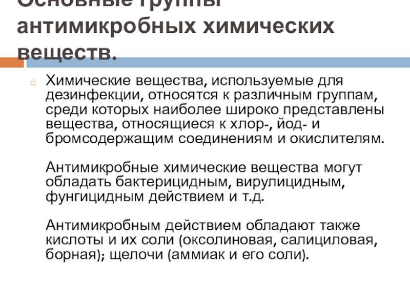Антимикробные химические вещества могут обладать бактерицидным, вирулицидным, фунгицидным действием и т.д.