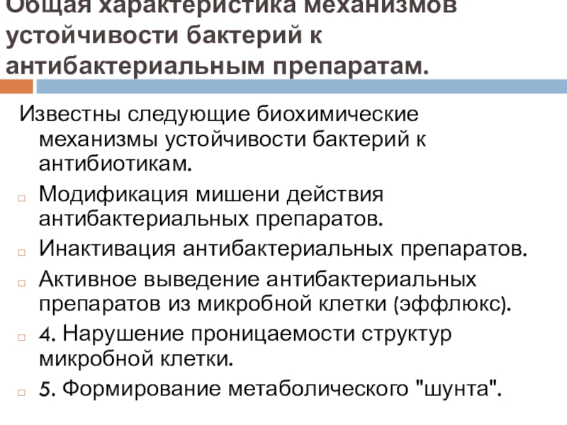 Слайд 10Общая характеристика механизмов устойчивости бактерий к антибактериальным препаратам.
