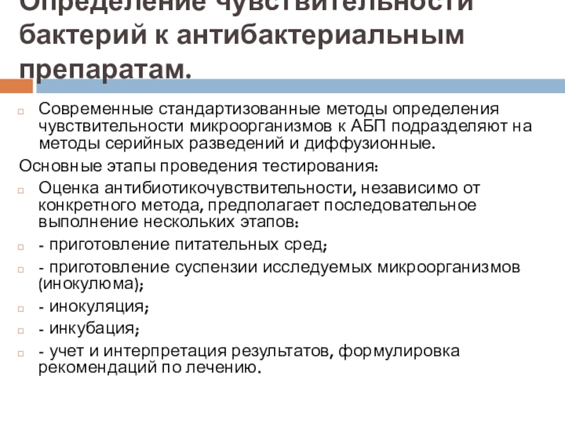 Оценка антибиотикочувствительности, независимо от конкретного метода, предполагает последовательное выполнение нескольких этапов: