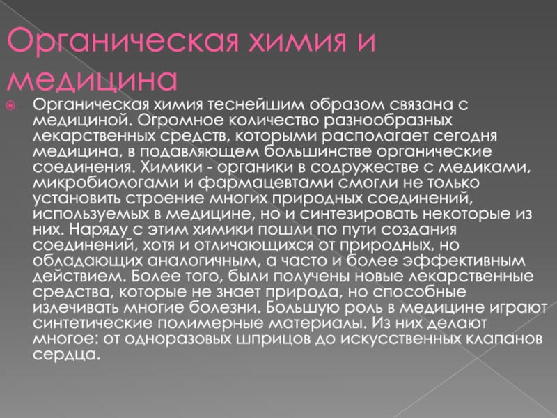 Слайд 3Органическая химия теснейшим образом связана с медициной. Огромное количество разнообразных