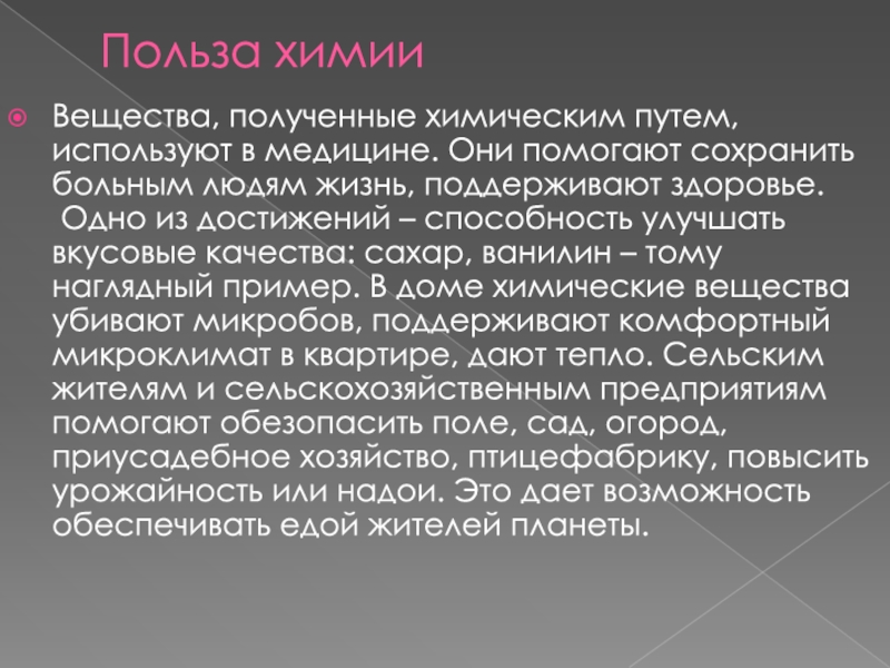 способность улучшать вкусовые качества: сахар, ванилин – тому наглядный пример. В доме химические вещества убивают микробов, поддерживают комфортный микроклимат в квартире, дают тепло. Сельским жителям и сельскохозяйственным предприятиям помогают обезопасить поле, сад, огород, приусадебное хозяйство, птицефабрику, повысить урожайность или надои. Это дает возможность обеспечивать едой жителей планеты.