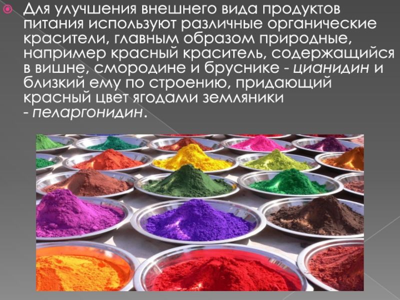Слайд 11Для улучшения внешнего вида продуктов питания используют различные органические красители,