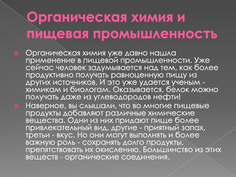 Слайд 7Органическая химия и пищевая промышленность